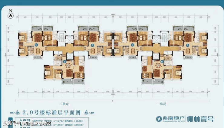 2栋和9栋是13层,共两个单元,每个单元2梯3户,每层共6户。