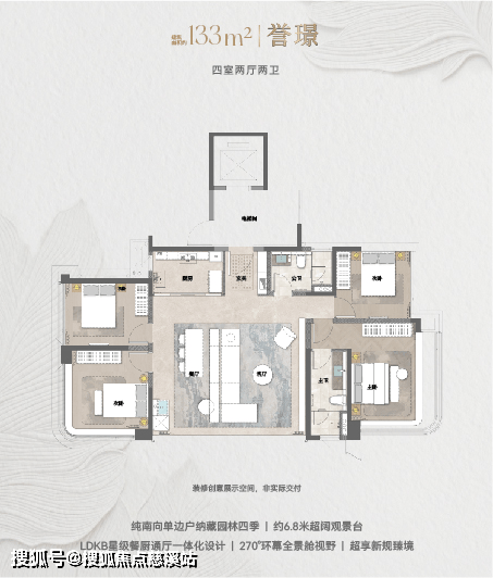 228㎡四室两厅三卫:配约 11.5 米超宽江幕观景台、约67㎡LDKB 云峯会客厅,双套房设计满足家族居住需求;205㎡四室两厅三卫:以42㎡洄游方厅、10.5 米奢阔观景露台为核心,强化空间通透感;133㎡四室两厅两卫:纯南向园景单边户,6.8米超阔观景台+LDKB一体化设计,兼顾实用性与景观体验,适配不同改善客群需求。