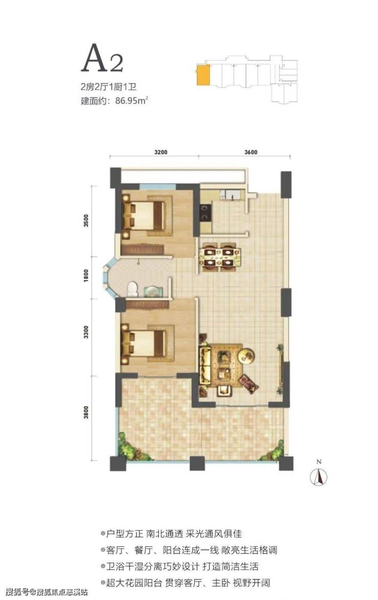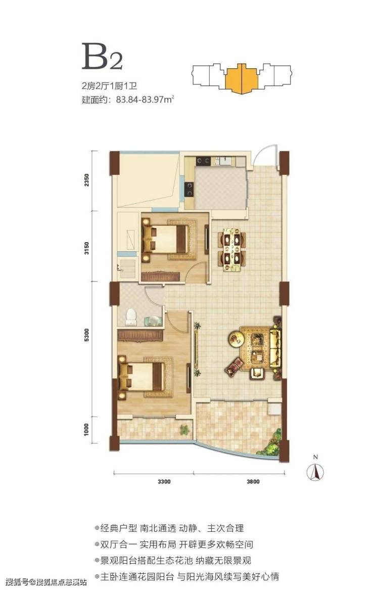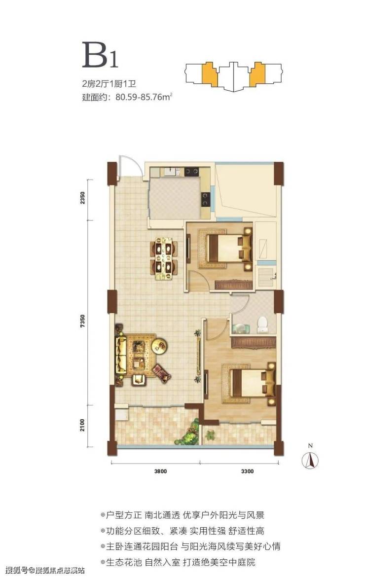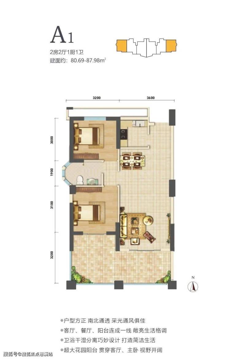 在售户型面积80-88㎡两房,户型方正,南北通透。