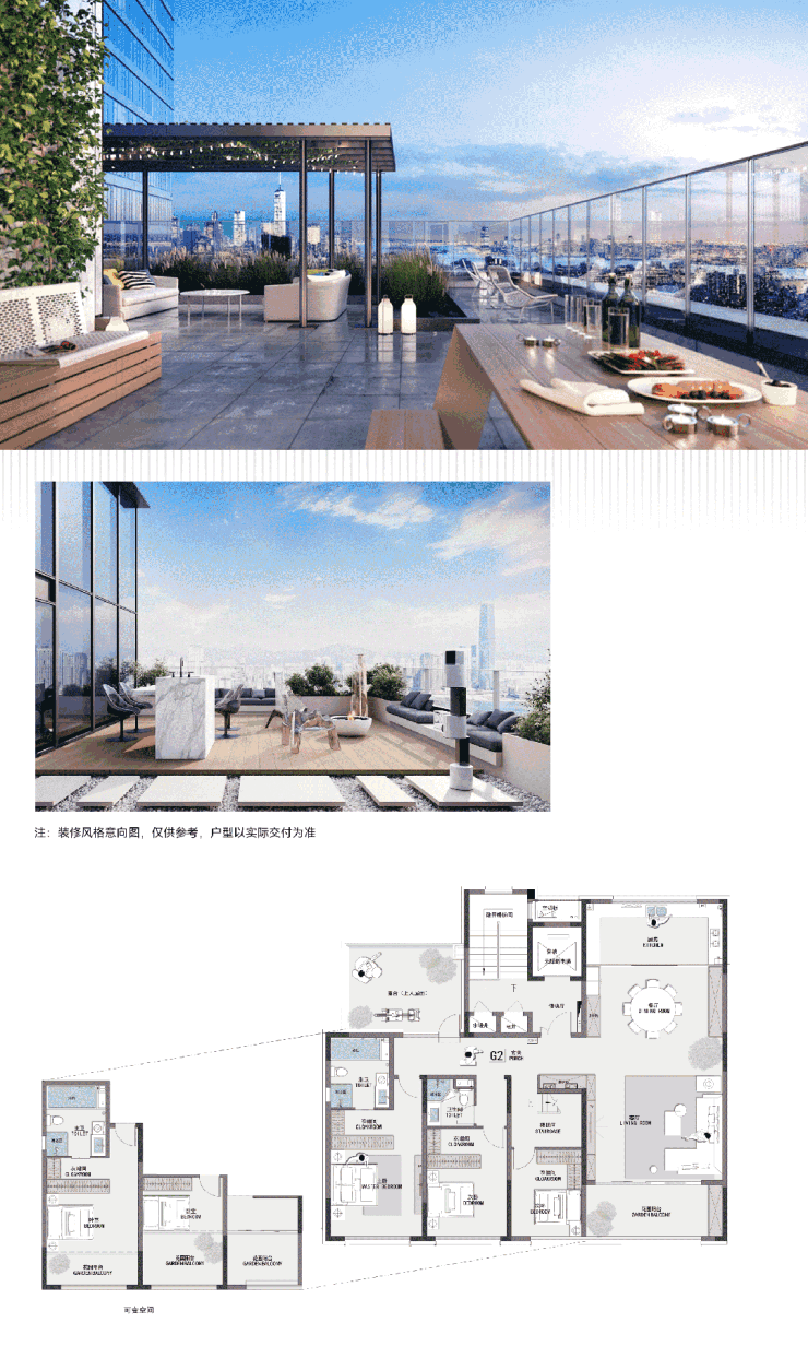 在古城中心,露台已然成为奢侈的代名词,而城发蓝城·凤起历山建面约297m²复式户型,竟奢享面积超百平的露台,令人惊叹不已。下层露台实用性强,可作书房或健身房;上层有三处露台,北向露台打造空中会客厅方便交流,西向露台布置私人花园或设烧烤区可享夏夜欢乐,南向露台采光好,可布置为阳光书房、观星台等,浪漫尽显。(注:挑空客厅改造后,南向露台将成为挑空客厅的一部分,上层空间变为两处露台)