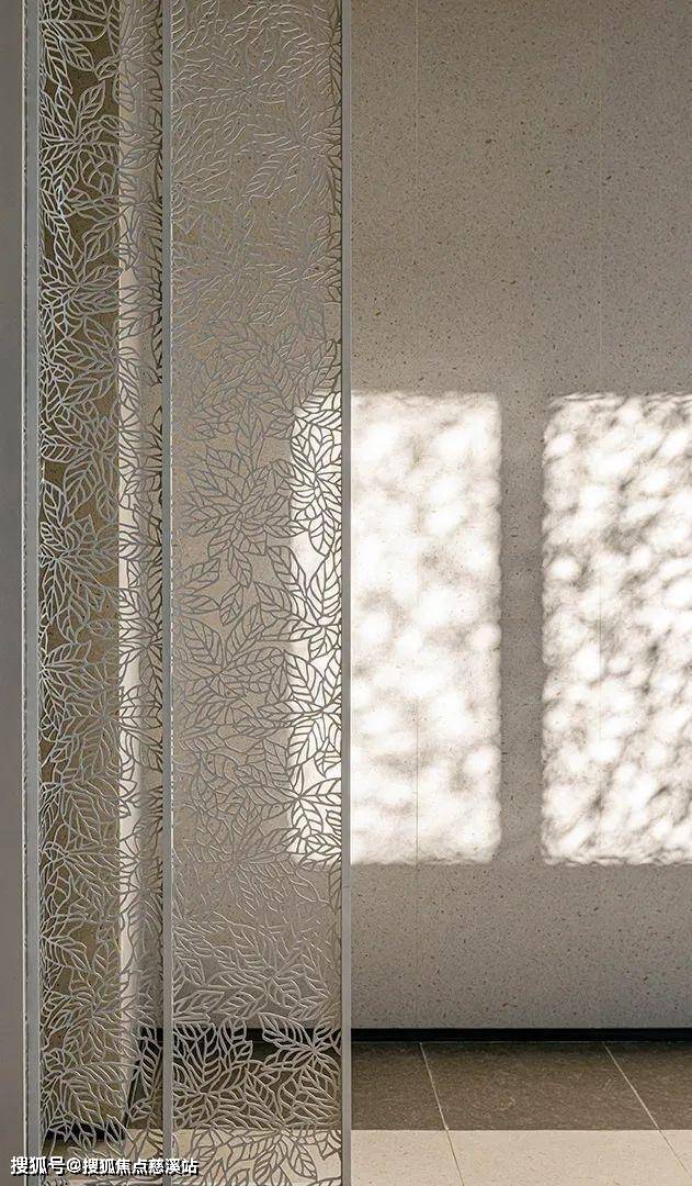 移步入户大堂内,吸引眼球的通高梧桐隔断,由专业工匠手工耗时匠心打造,象征南京地脉美学的梧桐叶脉纹路,不仅带来诸事祥瑞的美好寓意,更呈现出与众不同的艺术风韵。更搭配“千山暮雪”岩板背景墙、珍珠母贝门把手等,营造出颇具藏品感的场域氛围。归家即是故事,闲处便是光阴。