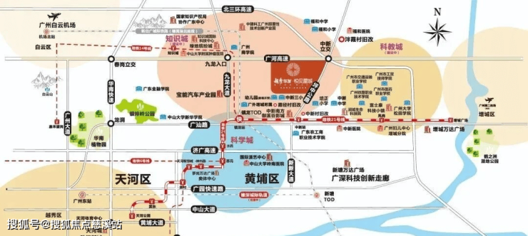 1站黄埔(镇龙站),3站天河(快线天河智慧城);高速就在家门口,40分钟直达天河,小区设置地铁21号线中新站、天河宏发广场(3号线石牌桥站)接驳巴士,广河高速、广汕公路,新白广城轨(镇龙站)、多路公交接驳线
