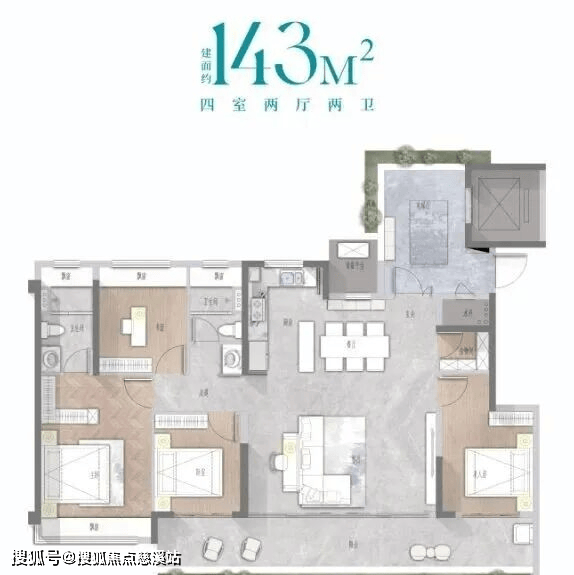 建面约143㎡平层奢宅:方厅+双厨设计,适合多人家庭欢聚