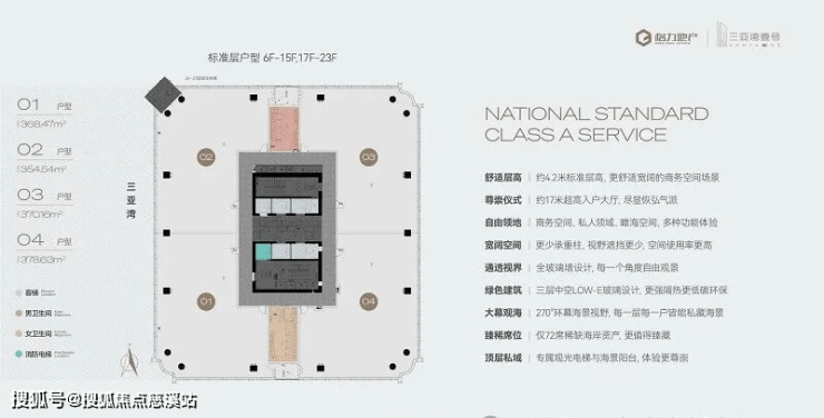 三亚湾壹号主楼约120米高、270°稀缺海景写字楼。产品类型有建筑面积约352㎡-374㎡商务资产(6F-15F,17F-23F);建筑面积约1596-1682㎡顶层资产(24F-27F),仅72席。公共区域精装交付,套内毛坯交付,由戴德梁行提供定制高端物业服务。