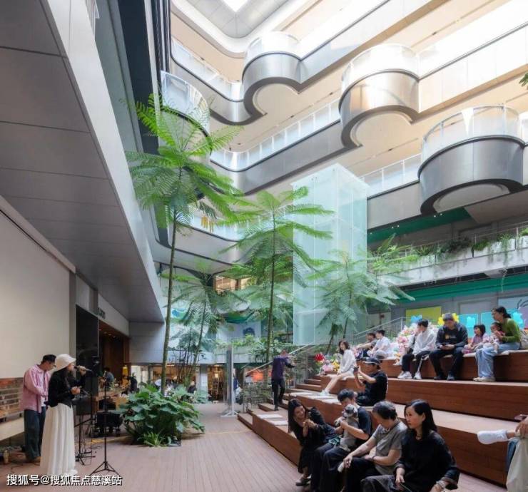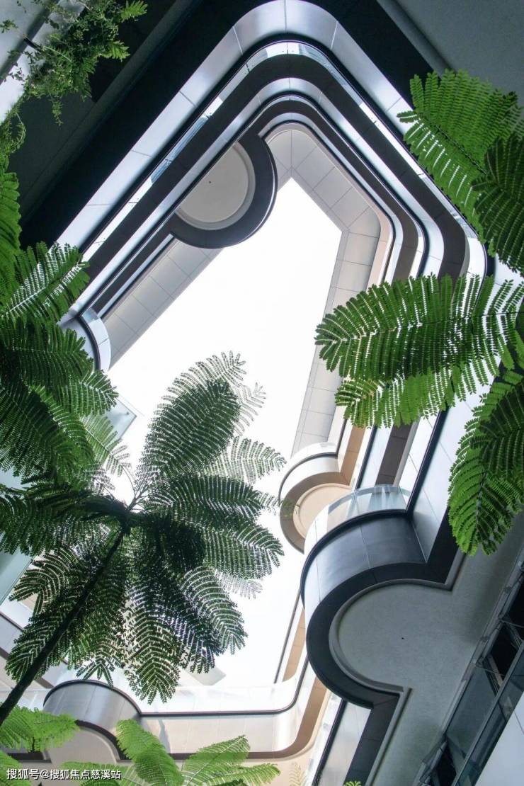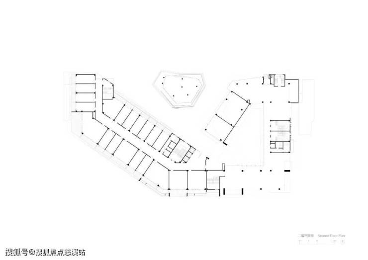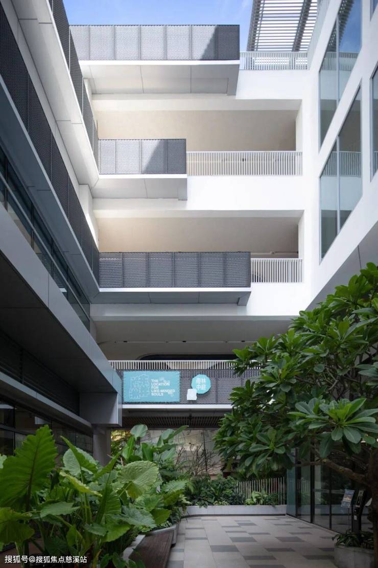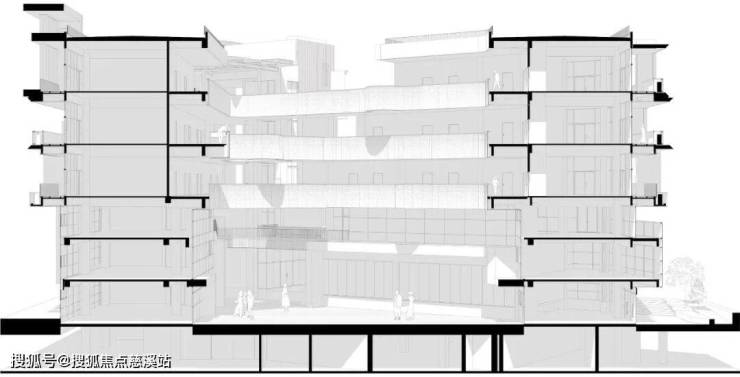 主要面对湿地公园 ?这虽自然,但会忽视北侧的入口关系;若优先营造街道立面,又容易使建筑背对公园,姿态消极。我们试图兼顾两者。我们尝试采用S型的体量,相互缠绕,从而创造两个庭院空间,并形成穿过建筑的通道。西侧的庭院和道路相连,形成类似城市广场的放大节点;东侧的中庭更具探索性,同时向上和向后延伸连接南侧的公园。两个庭院通过部分下沉的空间来连接,不仅提供了宝贵的阴凉,更在公园与街道间构建了一条“洄游”路径。行人可在此自由穿梭,体验探索的乐趣,弥补了新区所缺失的宜人步行感受。