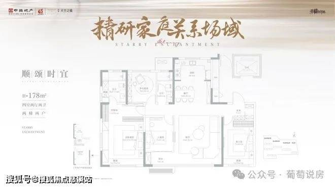 178㎡四室:南向面宽15.7米,LDKB一体化边厅,打通次卧可享8米宽厅,适配多场景家庭需求;