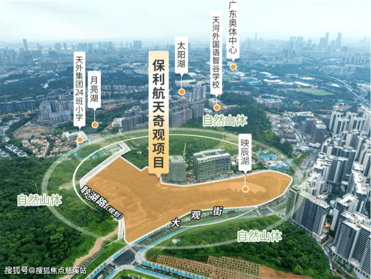航天奇观二期宅地(天河智谷片区023地块)就在世界大观旁,紧邻保利天汇东侧、缦云广州北侧。从配置来看,项目低容积率+南望小湖泊,可以看作mini版本的世界大观。