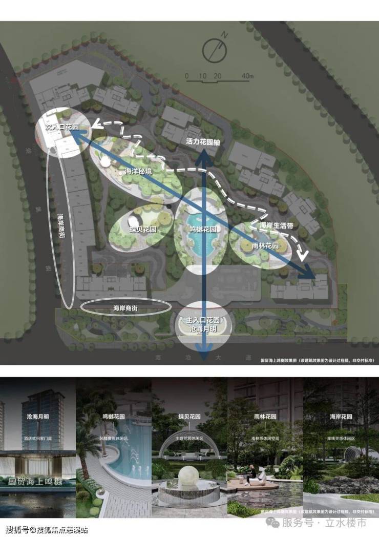 规划两轴一心一带多花园社交空间,将岛屿空间融入景观节点设计与场景串联,实现感性与理性美学的巧妙转化,缔造一座湾芯之上的酒店式度假庄园。