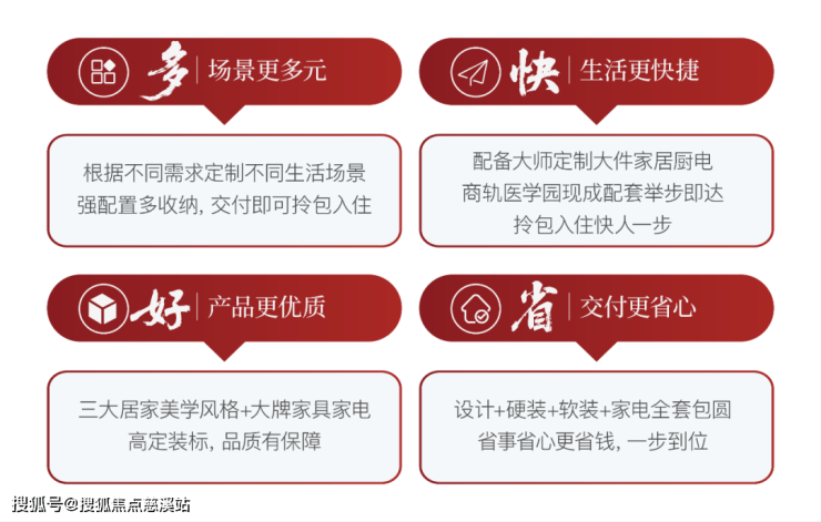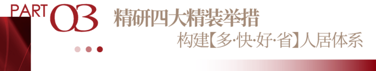 从空间的外在呈现到内在功能,从生活的物质需求到精神体验,精心雕琢“场景、生活、品质、成本”四大人居理念,深入生活的每一处细微角落,带来新一代理想人居解决方案。
