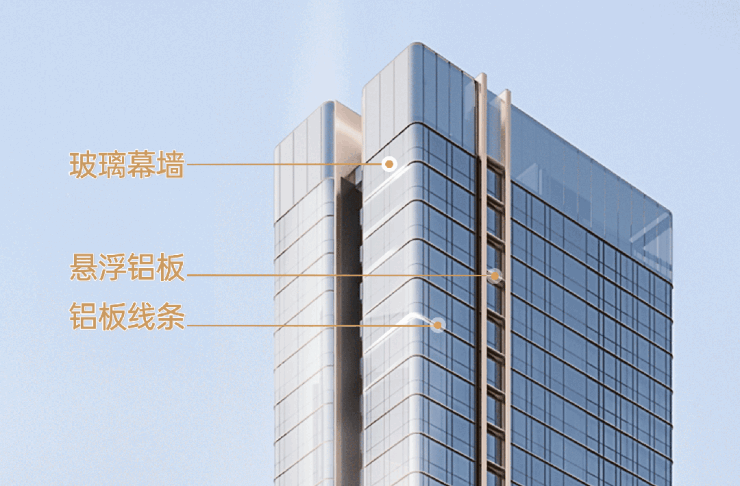 金属玻璃全包裹塔身,搭配悬浮铝板,超一线的豪宅立面材料,在阳光照射下熠熠生辉,很美,但也很贵。