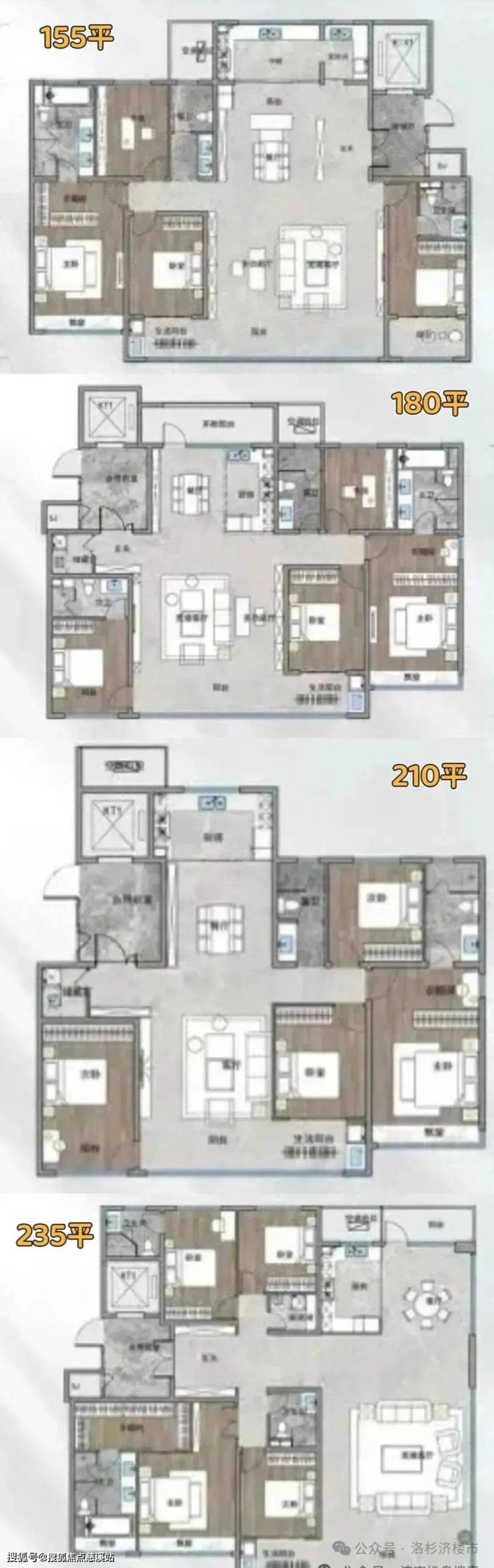 最小户型152平,占比40%;最大290平;另外还有159/175/189/230/240平。赠送面积不少,主要是空中露台、设备平台、开敞式阳台。总价在500-1000万不等,精装交付。