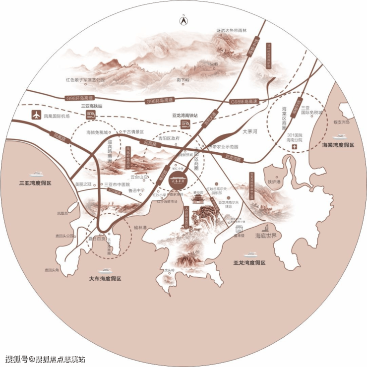 项目位于三亚榆亚路中段,凤凰岭城市生态景区东麓,吉阳区政府南约2公里,“国韵山水园林”的古典中式审美,开启三亚国潮度假生活。