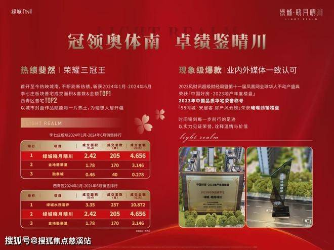 绿城·晓月晴川作为奥体南改善封面作品,是天津绿城首个“轻重协同”项目,更是品牌标杆项目,一经问世即成为市场焦点,屡创销售“奇绩”,斩获2024年1月-2024年6月李七庄板块成交面积、套数、金额三冠王西青区销售TOP2的佳绩,获得业内外的一致认可。