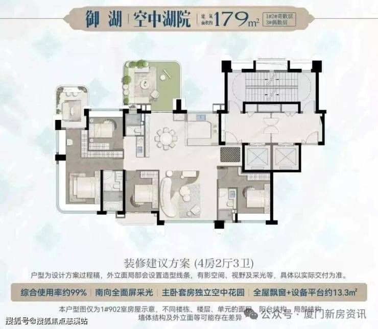 望湖建面约179㎡户型,约30平双露台打造“空中湖院”,还带约10平的独立电梯厅,空间使用率高达近100%,层高约3.15米,约70m家庭欢聚空间,套内可比肩220m大平层。全屋6开间朝南,北向又几乎是全明露台和开窗,高区推窗尽揽约1500米宽阔湖面。