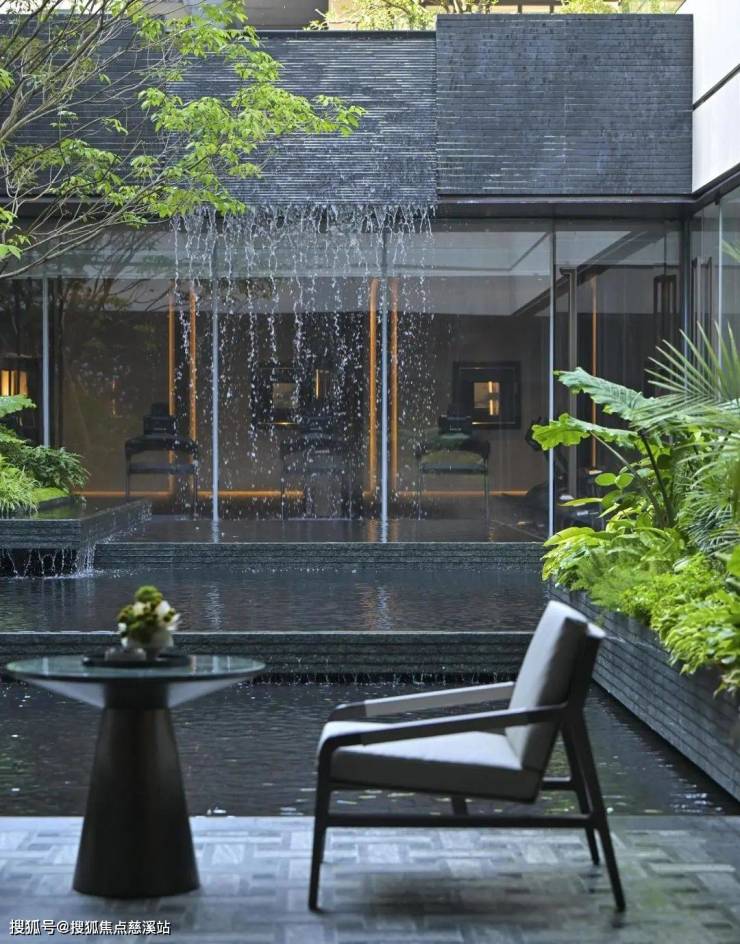 下沉庭院旨在打造一个观赏性及沉浸感极强的森谷林涧,6米高的落瀑水流奔泻而下营造出林间瀑布景观。融合造型上的疏朗现代感,形成隐谧而清新的氛围。