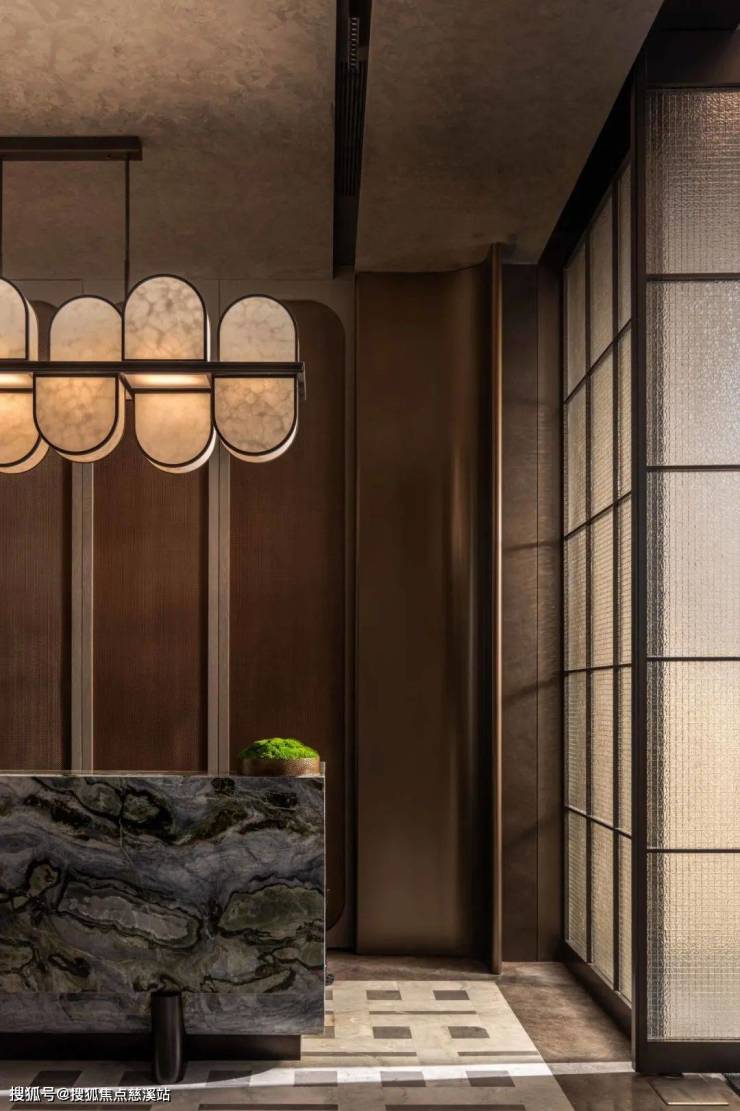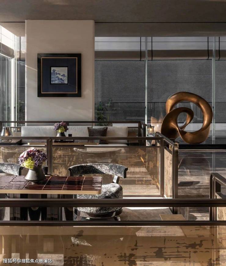 接待区空间设计独特,艺术玻璃神秘面纱、有序格栅坚韧骨骼、全景落地玻璃极致视野,共同创造深刻空间张力。灯具吊饰光韵细腻素雅,极简与穿插手法演绎现代雅奢风格。