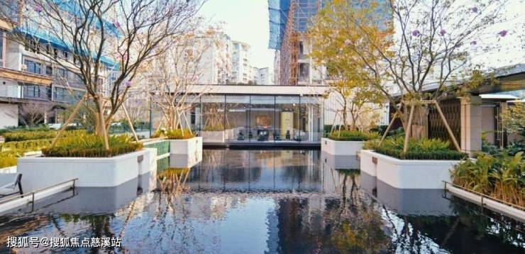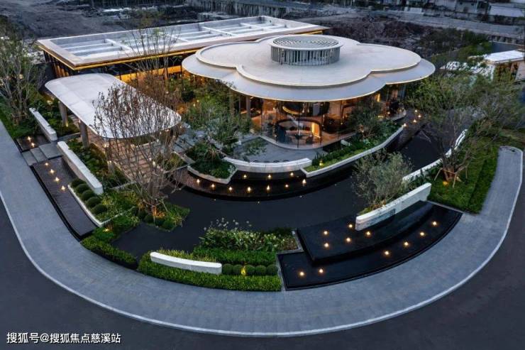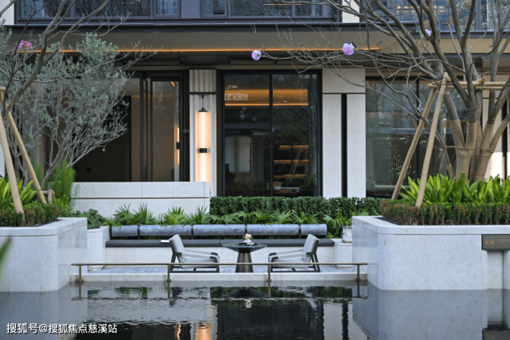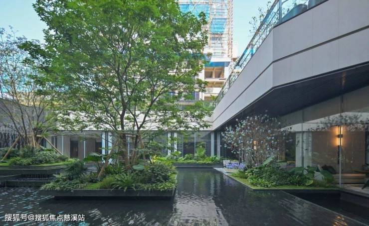下沉平台采用圣诞米黄大理石花池搭配带有南方热带的种植氛围的植物,提供独特的休憩空间,感受绿意与水声交织的美好。
