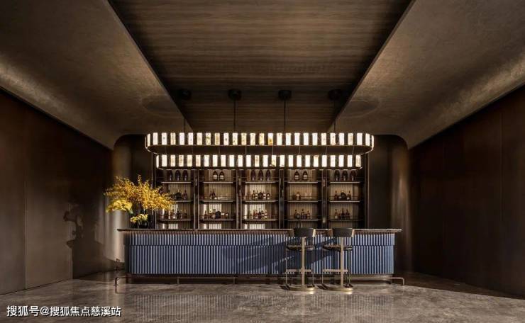行政酒廊雪茄吧弧面吊顶带来流动线条美与视觉盛宴,木饰面增添自然触感与温暖氛围,与弧面形成鲜明对比,丰富视觉层次。仿鳄鱼皮材料增添奢华感与高贵精致氛围。圆弧形吧台成为视觉焦点,增强空间吸引力与艺术氛围。