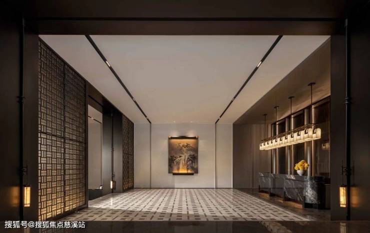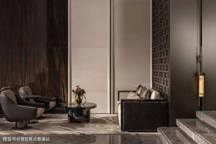 进入艺术酒店式的礼悦门厅,通过九级雅阶拾级而上,映入眼帘的是流沙棕奢石背景墙,石材纹理飘逸灵动宛若隐逸深山,艺术铜板画融入其间,气势恢宏与艺术气息并存。
