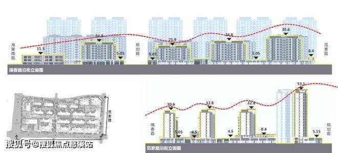社区整体以『两轴多中心』为结构,东西向景观轴线,南北向交通轴线作为地块的主要架构,以功能及景观中心构成的多个活力、景观节点形成多中心结构。同时,在保证地块货值最大化的基础上,通过层数变化形成高低错落的天际线,打造错落有致的空间层次。