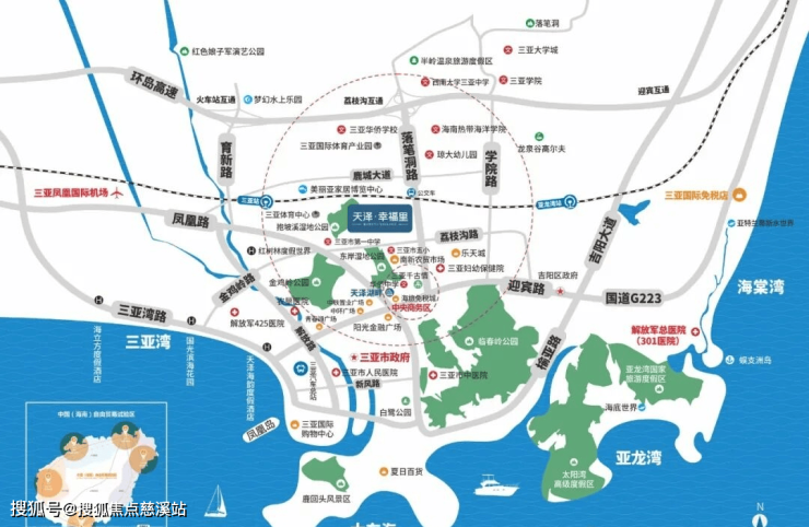 “全省规模最大的三亚市妇幼保健院”距离项目约500米;三亚市人民医院、农垦医院、三亚市中医院等“三甲医院”以及解放军425医院,解放军301医院。