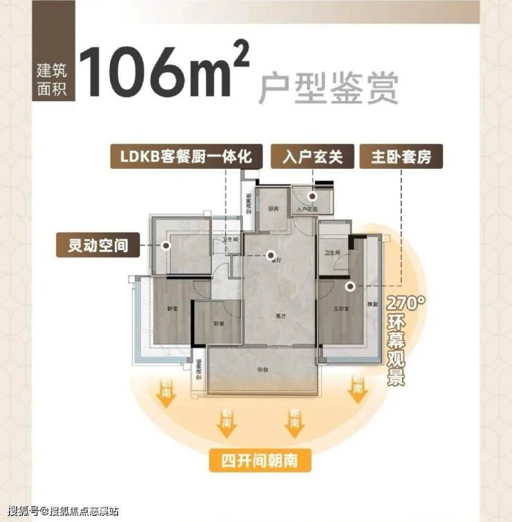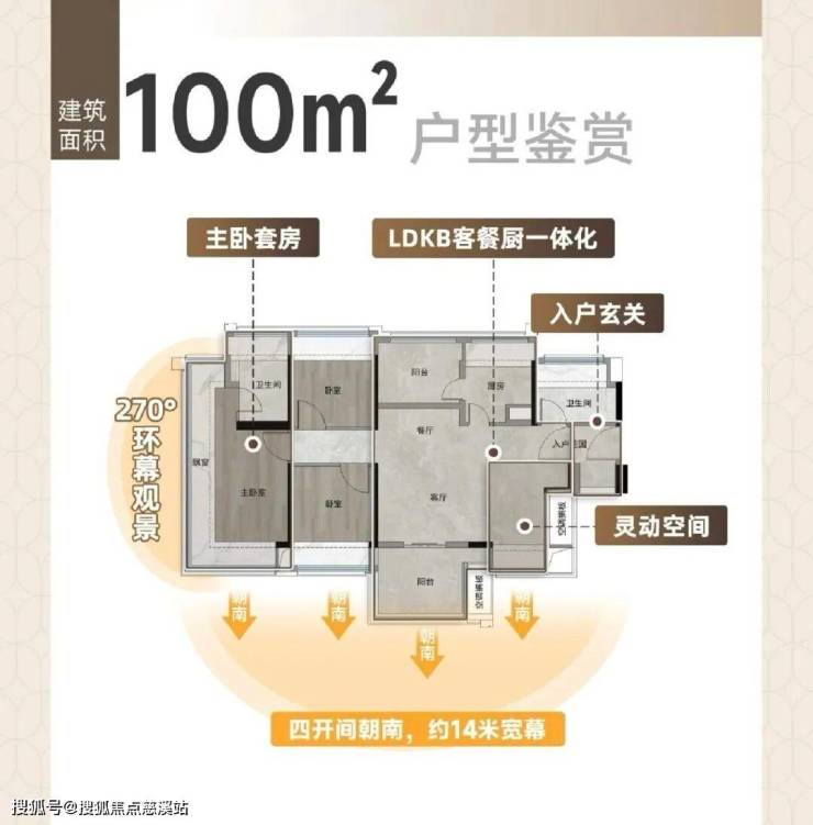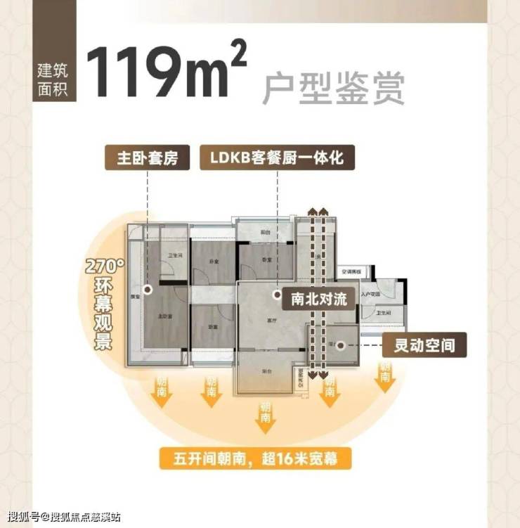 横厅+南北双阳台,五开间朝南,17米宽幕采光,高层还能远眺白云山山景,但所在踢腿靠马路有噪音。主套带独立卫浴和衣帽间,270°环幕视野,尺度堪比大平层。可惜是单主套,没能做三卫。