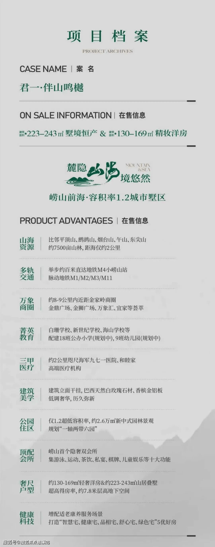 作为崂山前海1.2容积率城市墅区,君一·伴山鸣樾精研崂山层峰居住习惯,以定制化设计思维,打造「建筑面积约130-169㎡精妆洋房&建筑面积约223-243㎡山居叠墅」。