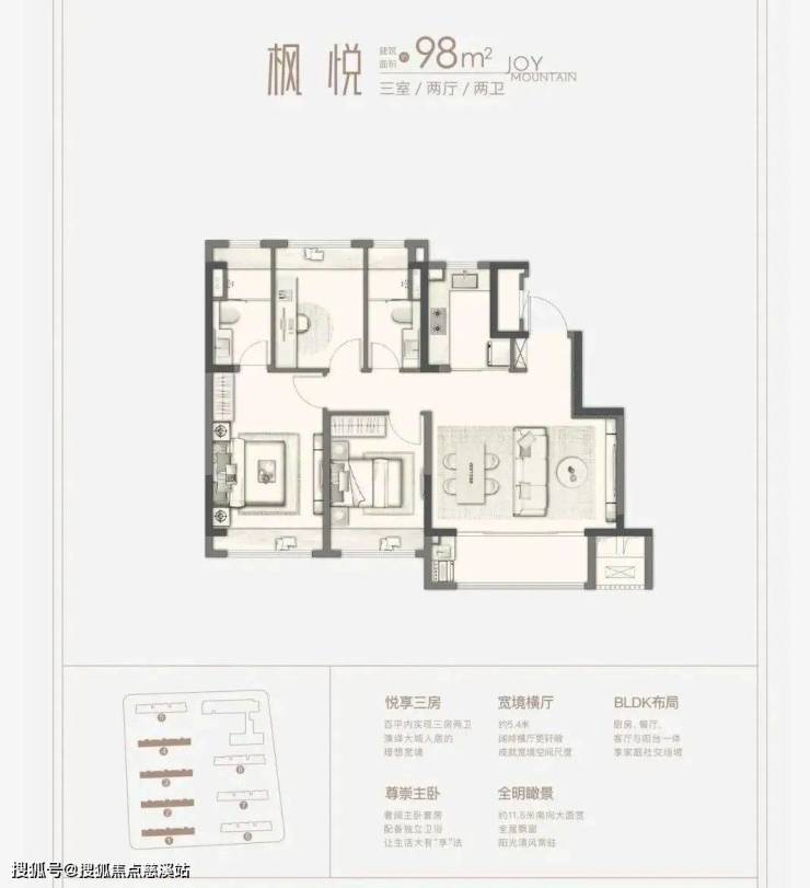 建面约98㎡三房两厅两卫的户型,打造了约5.4的横厅,连通双阳台,约11.5米南向大面宽,主卧套房独立卫浴,超高得房率造就居家生活品质。