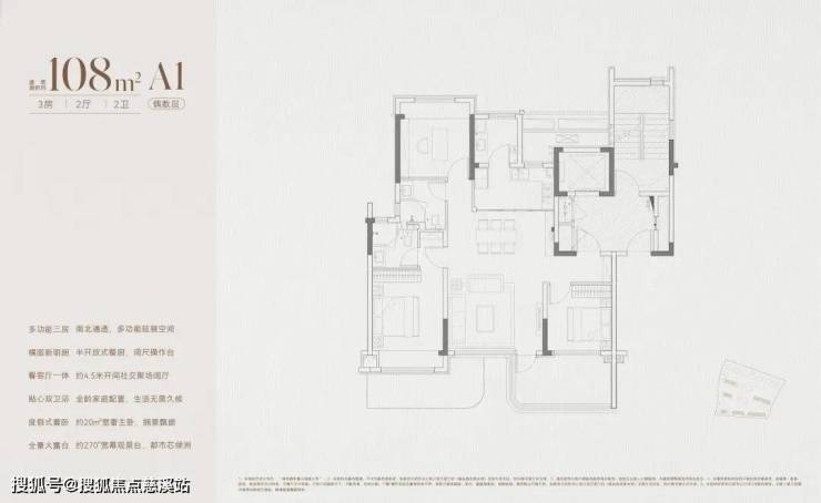 建面约108㎡户型配比约占A地块一半,为经典的十字户型设计,南向主次卧分割在客厅左右,私密性好,厨房连接家政延展空间。主卧套房设计,面积约20㎡,带超大南向飘窗。270°弧形露台,偶数层连接局部客厅+南向次卧,奇数层,链接链接局部客厅+主卧。