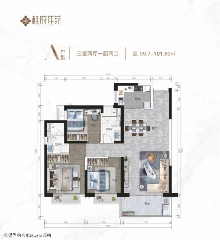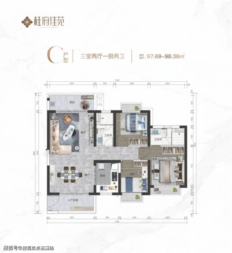 3 房 2 厅 2 卫:约 92/98/101㎡