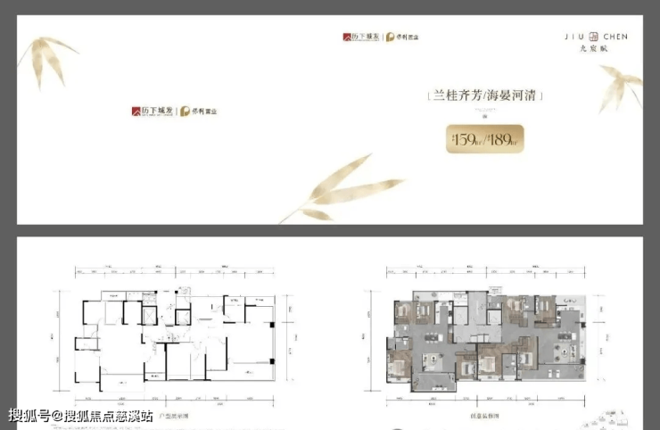 159-189平位于3号楼东单元。159平与152平宽厅类四叶草户型格局类似,客厅开间更宽,达到了6.5米,南向面宽13.3米;189平为端厅四室,客厅开间6.89米,南向面宽15.8米
