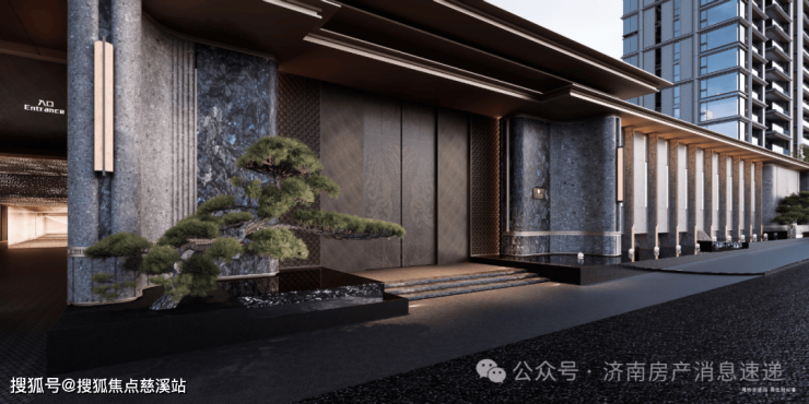 九宸·云台擎荷,整体门头柱子如荷叶托举的云台之境。明月松间照,清泉石上流;三级台阶、步步高升
