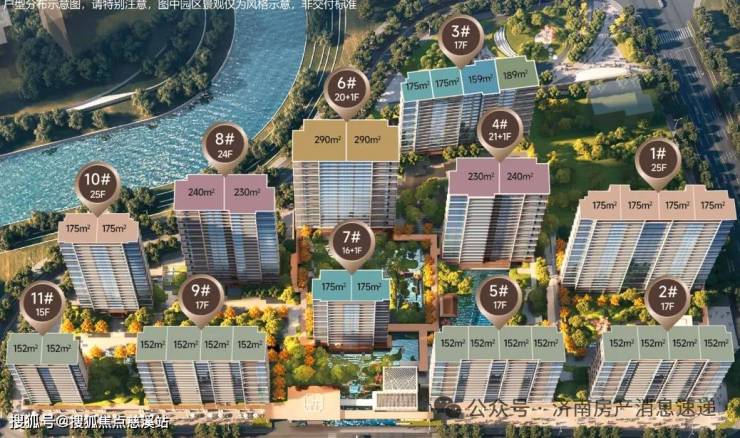 户型分为八个面积段,152-155-159-175-189平为正常住宅,230-240-290平为四代宅,所有户型至少能达到两梯两户标准,且为同层排水