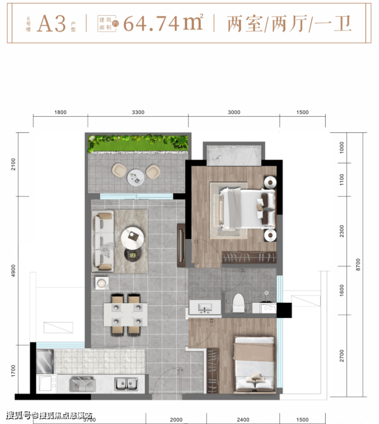 A3户型约64㎡精致两房两厅一卫