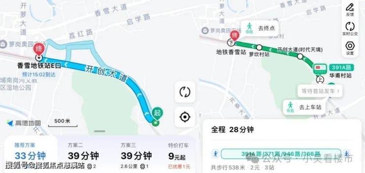 距离项目最近的地铁是香雪站,乘坐6号线,4个站可达天河,不过地铁站距离小区比较远,步行得2.1公里,要走半小时左右,只能通过小电驴接驳了,不愿意走路或者小电驴的话,可以通过公交接驳地铁,大概也是半小时左右的车程。