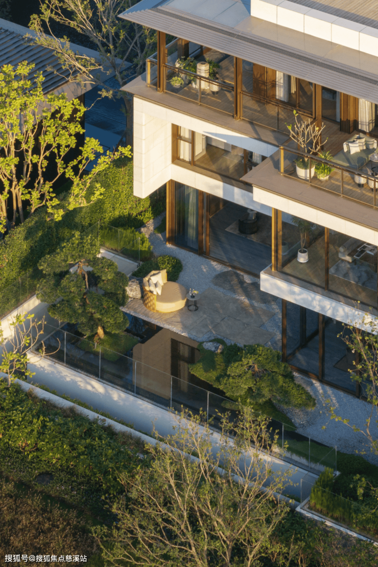每一户均配备近6米挑高的超大空中庭院,带来约270度的景观视野,部分户型庭院面积高达约50㎡,搭配上下错层、约1.2米外飘挑檐的设计,守护居住私密性。