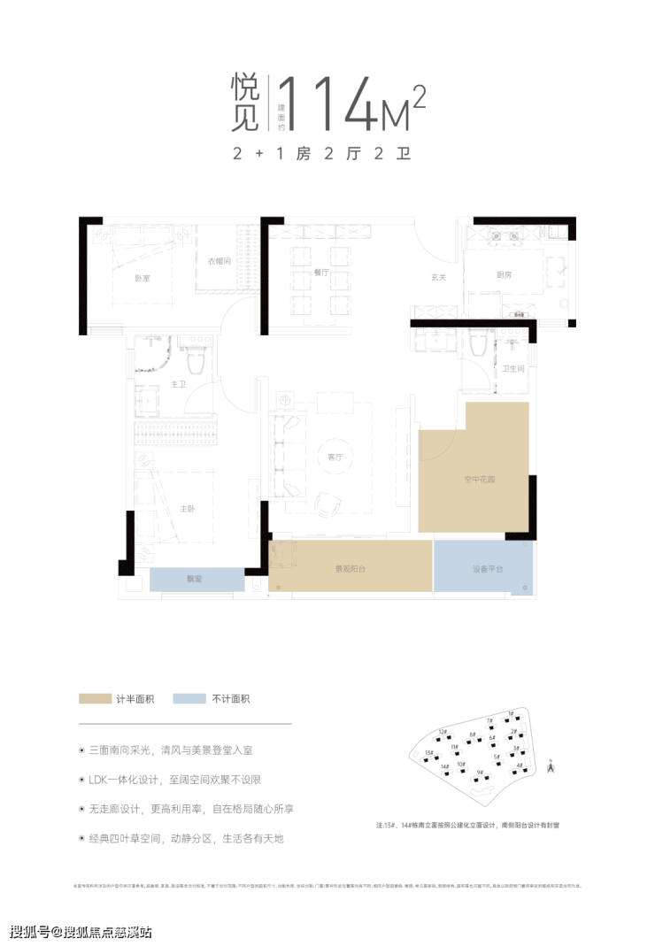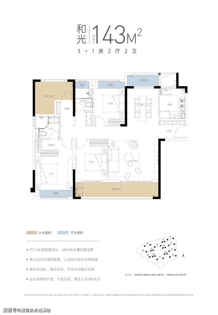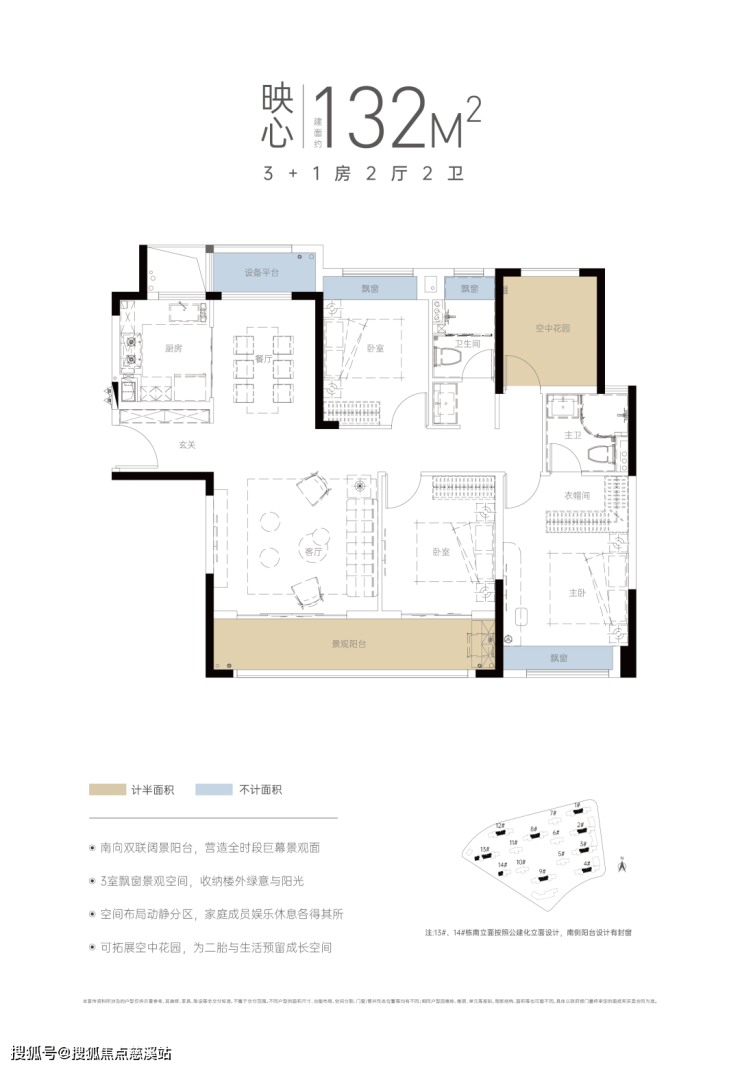 而且项目产品的得房率相当高,飘窗及设备平台的位置不计面积,空中花园和景观阳台等位置仅计入一半面积。