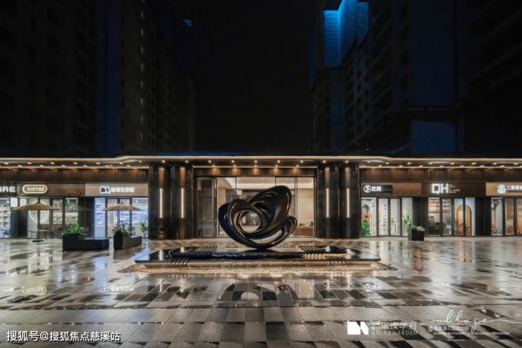 东广场中央的主题雕塑,以花瓣雏形延伸而来。通过不锈钢材质搭配热着色工艺镶嵌的暗绿元素,结合灯光呈现出“璀璨星空”视觉效应。
