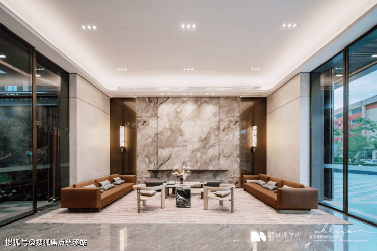 另外,项目东入口面积约120㎡,层高约5.5米的社区大堂每一个细节也是非同凡响。地面使用了大面积的名品石材,右侧墙面铺满大面岩板,休息区还放置了全真皮材质包裹的沙发……