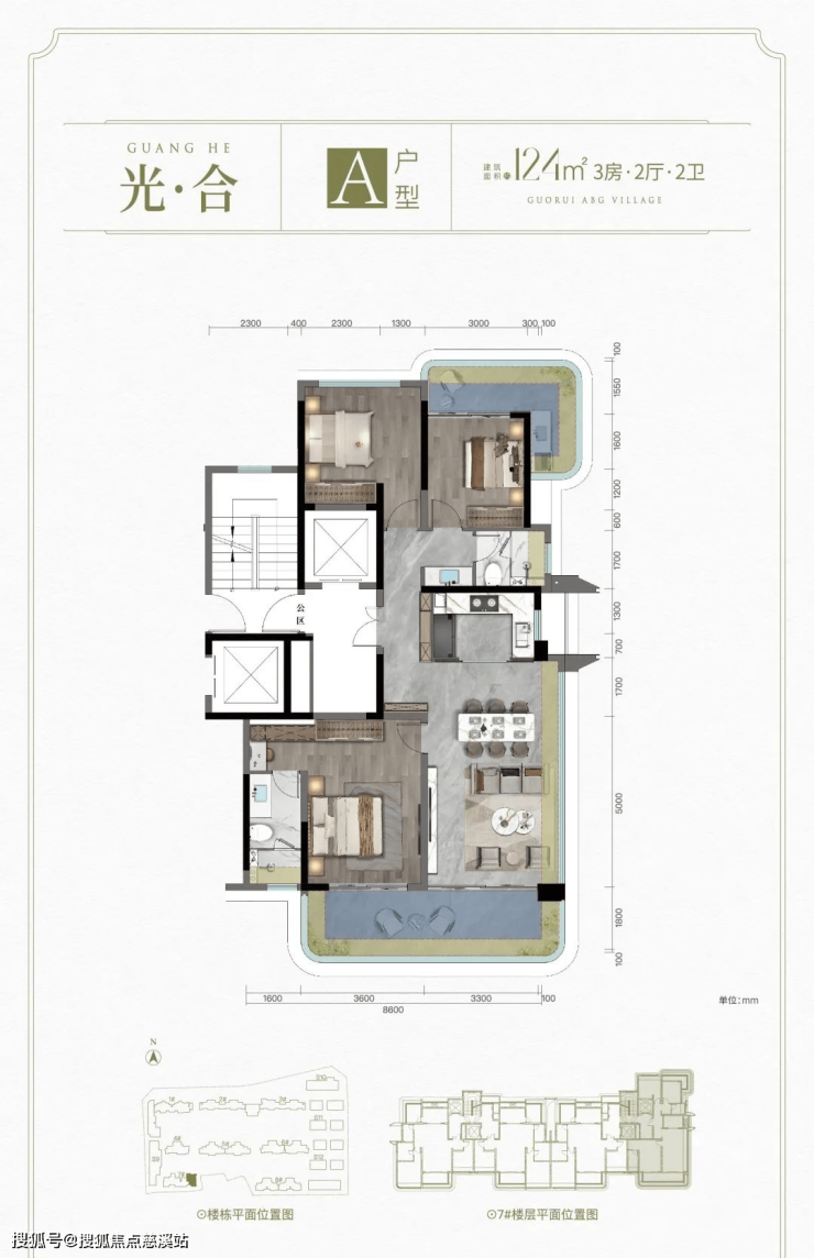 A户型: 建面约124㎡ 3房2厅2卫