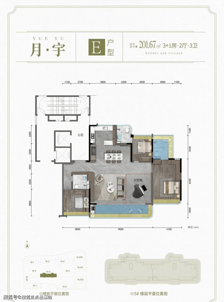 E户型: 建面约201.67㎡ 3+1房2厅3卫