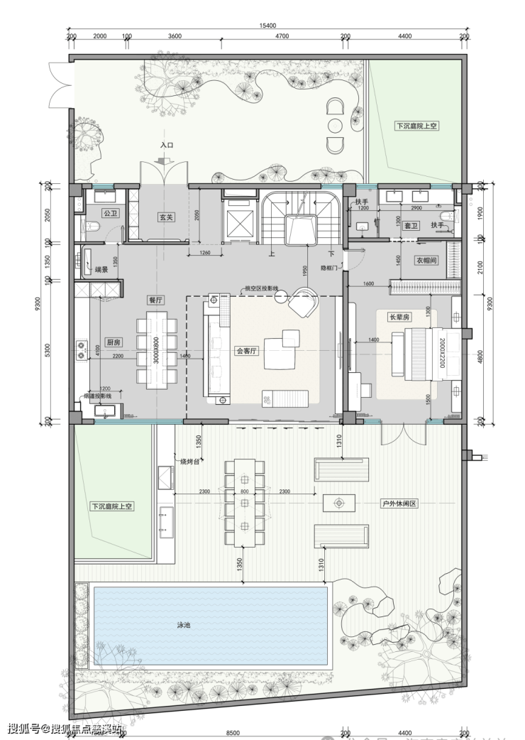 A户型(一字型)建筑面积:约143㎡,4房4厅6卫+2保姆房+2车位+1庭院泳池,使用面积715m²-1016m²
