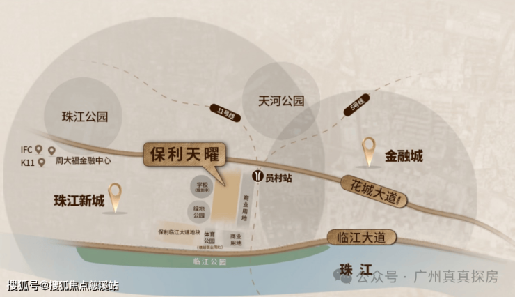 地块位于规划花城大道南侧,紧邻华南快速干线、黄埔大道中、临江大道及科韵路等主要交通干道,这也是天河比较难得的靠近地铁站的盘,地块东北侧距离地铁5号线与11号线交汇的员村站仅150m,5号线+11号线可以连通广州最核心的几个商务圈---珠城、琶洲、天河北、白鹅潭等等,通达性很强。