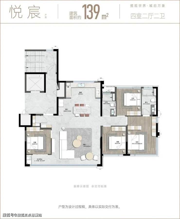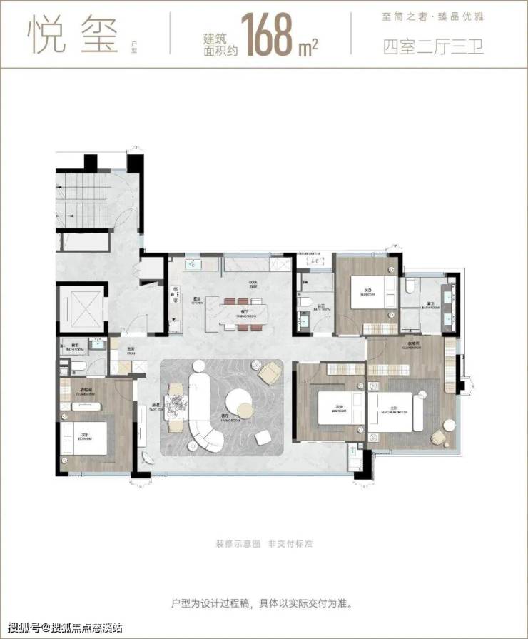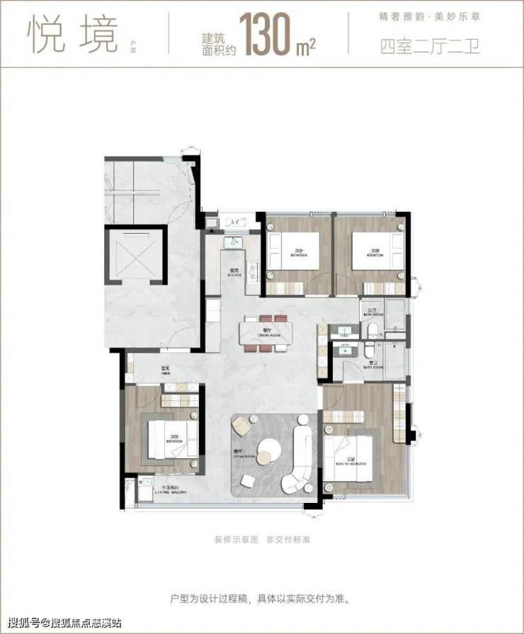 规划7栋高层及小高层住宅,共344户,主力户型为130-168㎡精装四房,得房率约90%-95%。