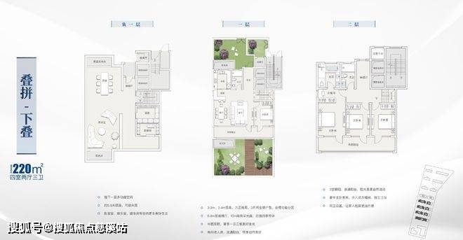 叠拼产品均为四室三厅三卫,下叠220㎡,上叠240㎡,都是双梯设计,预留有步梯和室内电梯,方便家人出行。