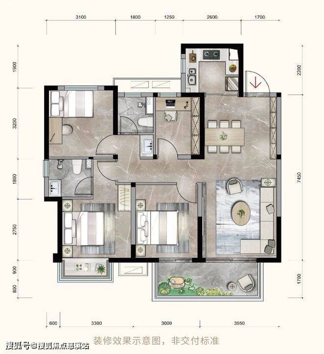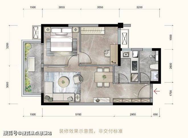 项目入门级的建面约68㎡户型,为2房2厅1卫设计。横厅设计让公共空间看起来更宽敞明亮,面宽超过3米的双卧室、约5.7米长的大阳台,都提升了整体居住的舒适度。