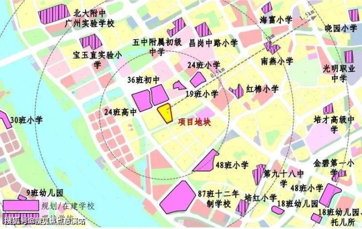 项目自身没有配建学校,但周边名校环伺,3km直线范围内包含广州市五中附属初级中学(省级)、广州市第41中学(省级)、宝玉直实验小学(光大校区)、江南外国语学校、工业大道中小学、红棉小学、海富小学、南燕小学、培红小学等9所学校环伺,拥有完善的区域教育体系。