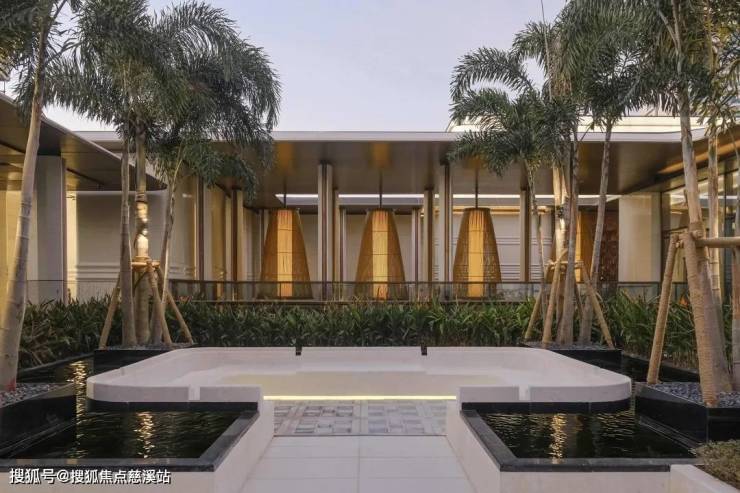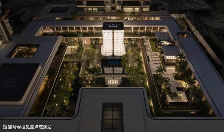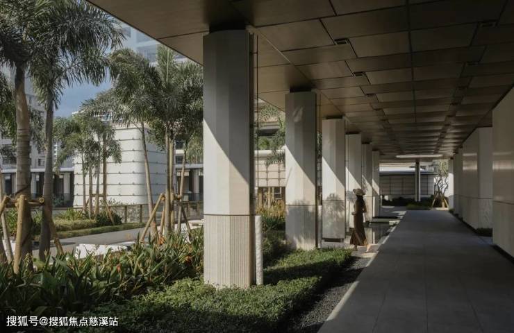 穿过归心长廊,便抵达项目"心脏地带"——中庭花园。这里被设计为开放流动的生态空间,将建筑、水景、植物与光影融为一体。花园以贯穿南北的镜面水道为核心,两侧设置方形花坛,种植形态优雅的乔木。环绕花园的是连续廊道系统,连接各功能区。
