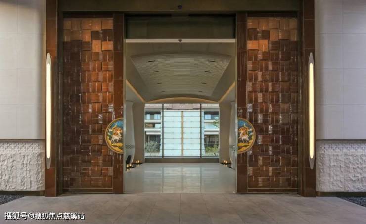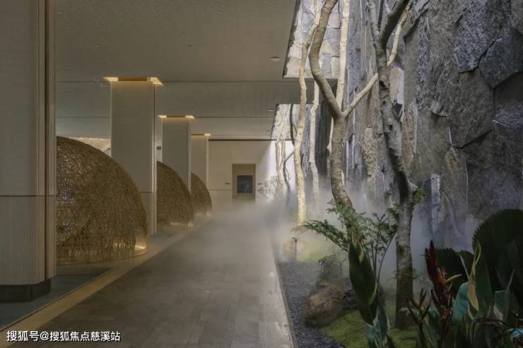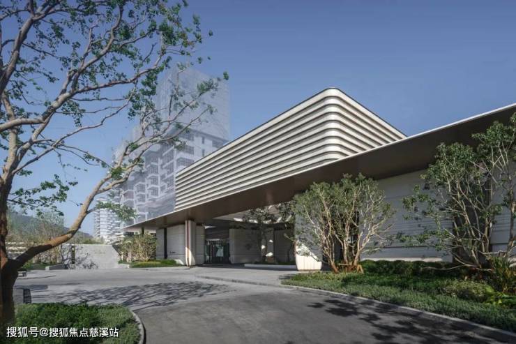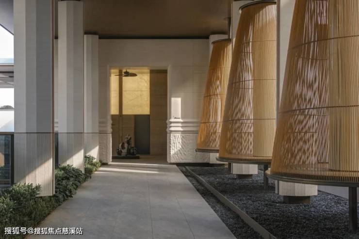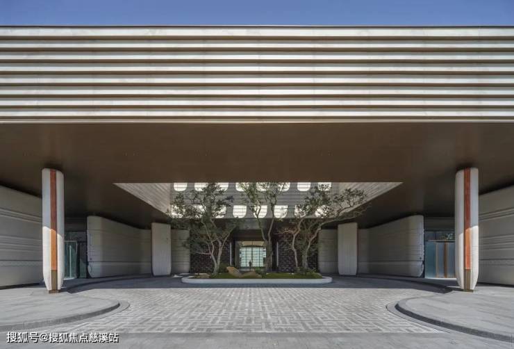 入口广场以人字形铺陈的石板地面为中心,两侧设低矮水渠。主入口摒弃了传统高耸大门或厚重墙体,代之以四根轻盈的弧形柱体,支撑起悬挑屋面。