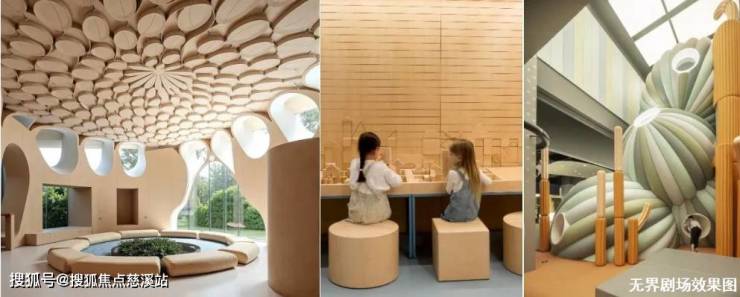 中央设置狭长镜面水池,水面如镜,水池一侧排列的数个3.5米高仿竹编灯笼,其原型来自海南渔民的传统鱼篓。